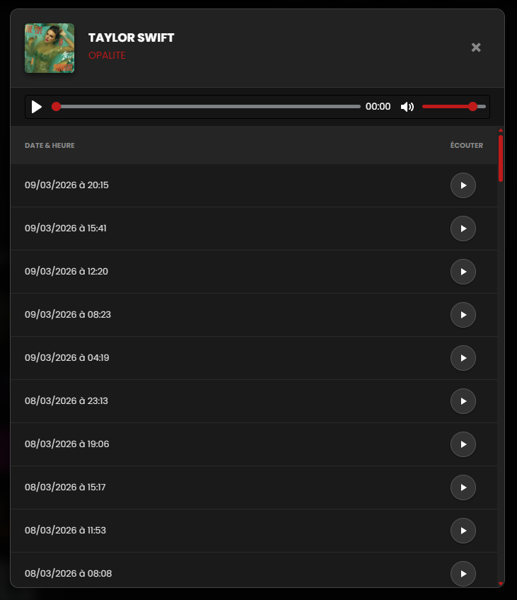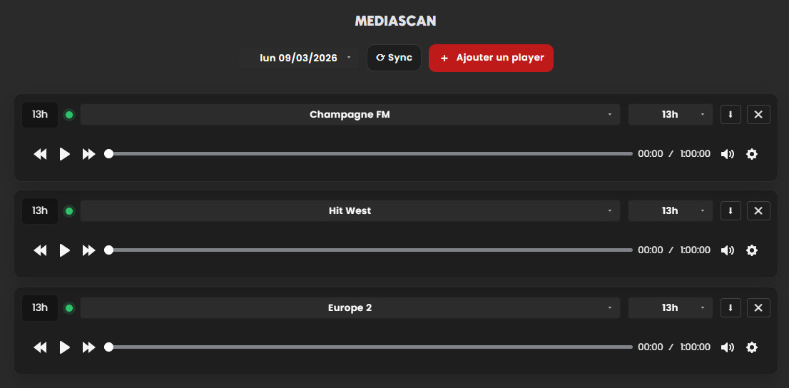 Interface permettant de comparer des heures en ajoutant plusieurs players sur la même page. Chaque player peut contenir une radio et une heure différente.