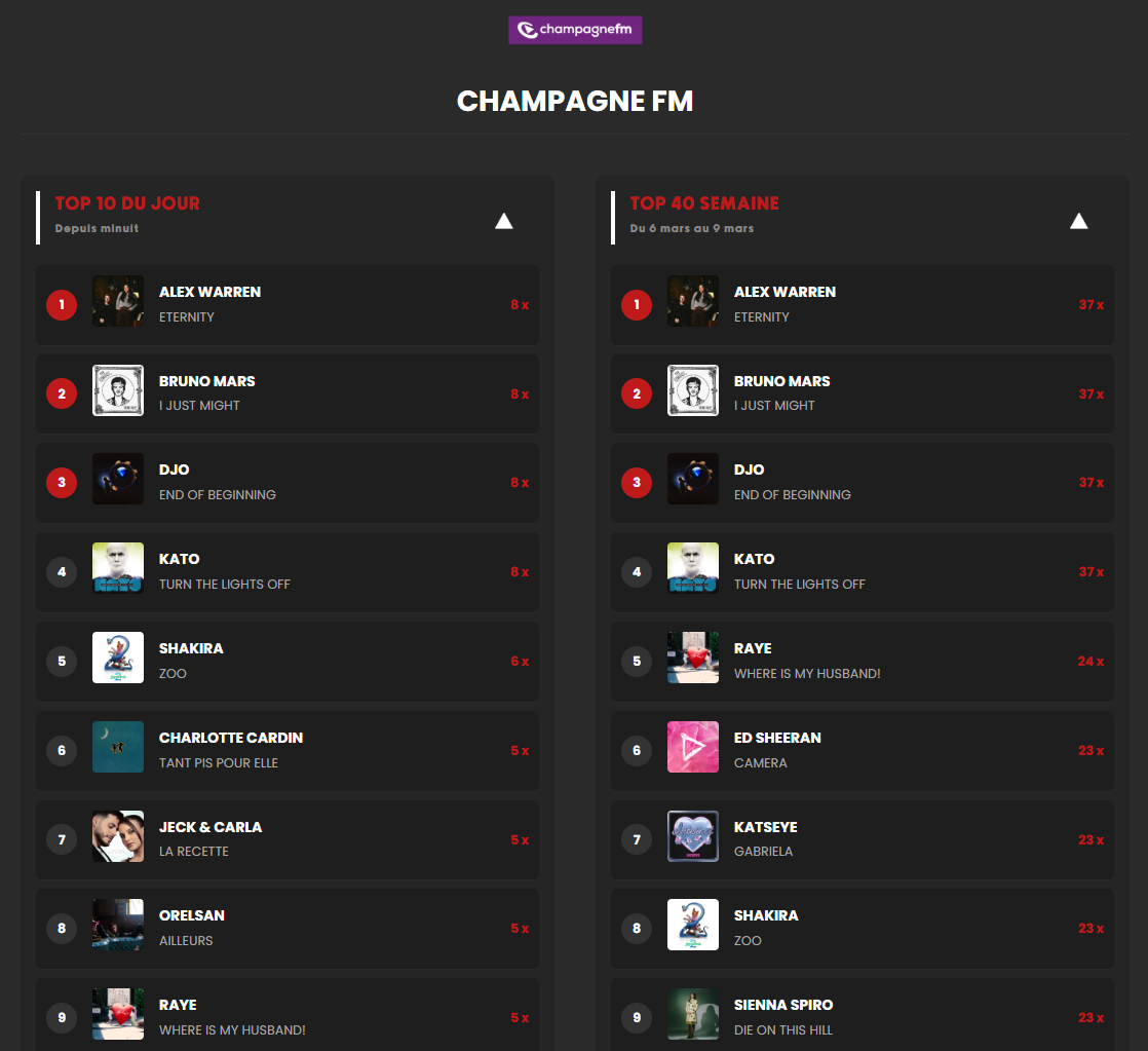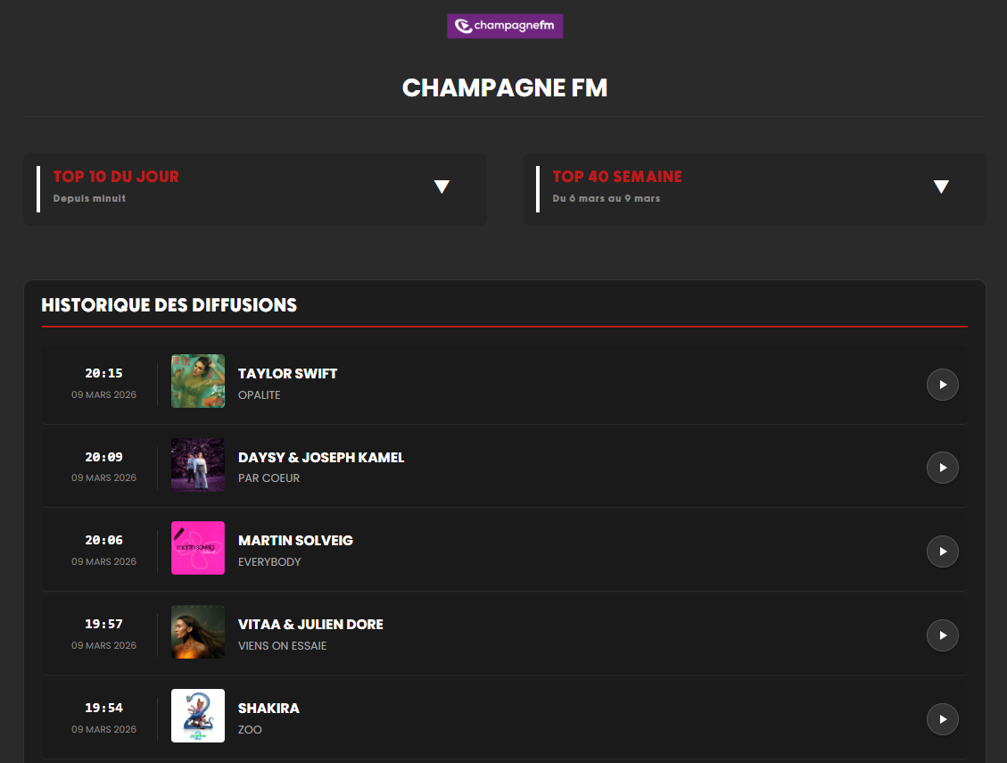 Consultez le TOP 10 du jour et le TOP 40 de la semaine de chaque radio du STORYCAST.